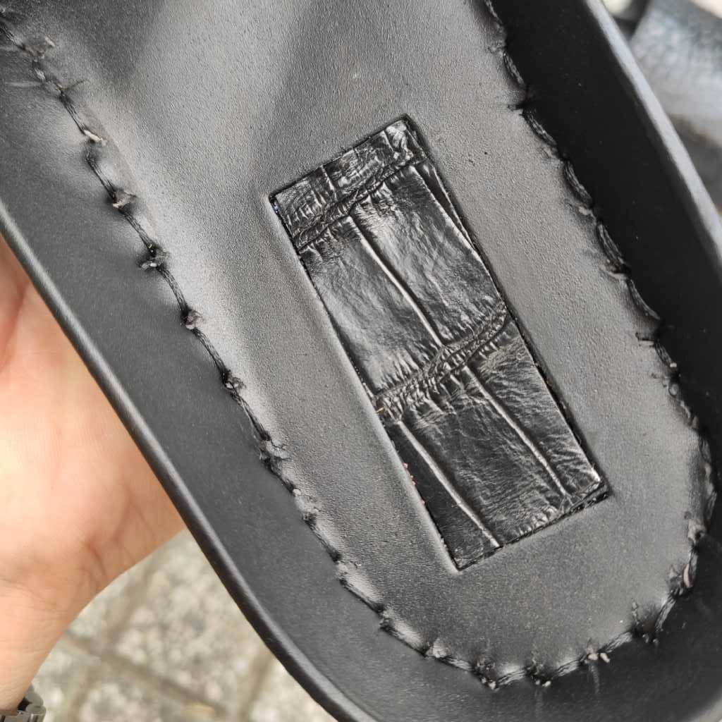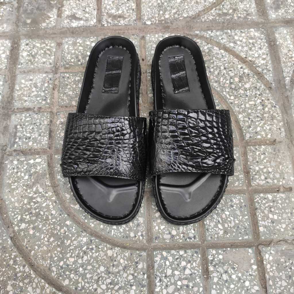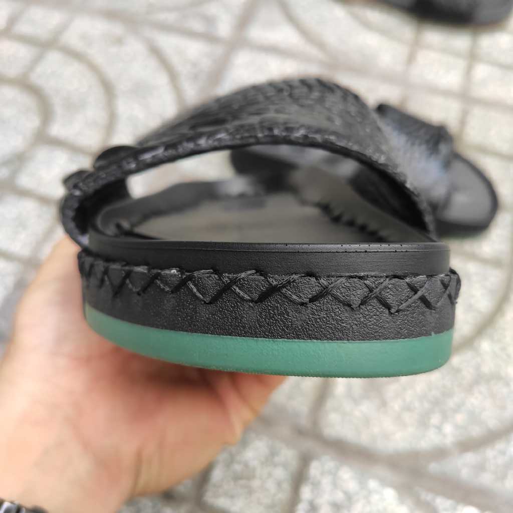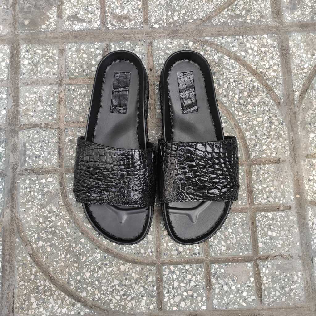 Da bắp tay cá sấu có gai nổi nhẹ đẹp tinh tế. Xung quanh dép được khâu thủ công bằng chỉ chuyên dụng cao cấp cho độ bền tối đa