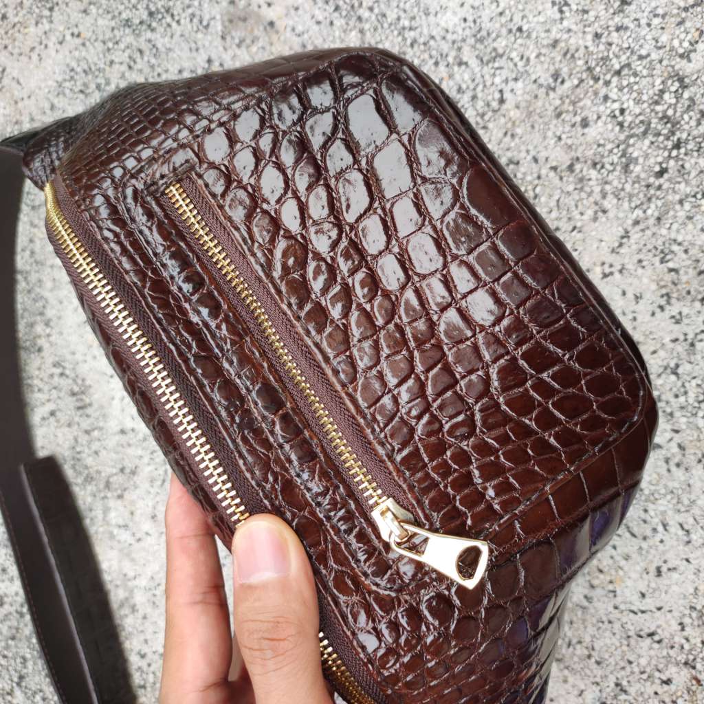VIDEO TÚI ĐEO BỤNG DA CÁ SẤU TRƠN MÀU NÂU