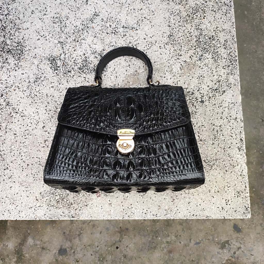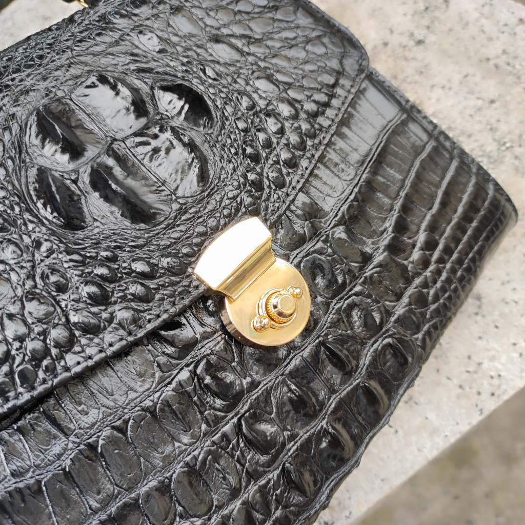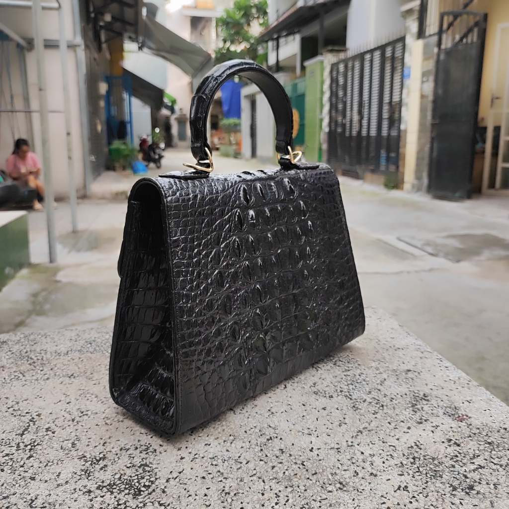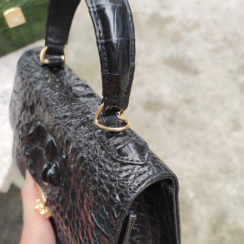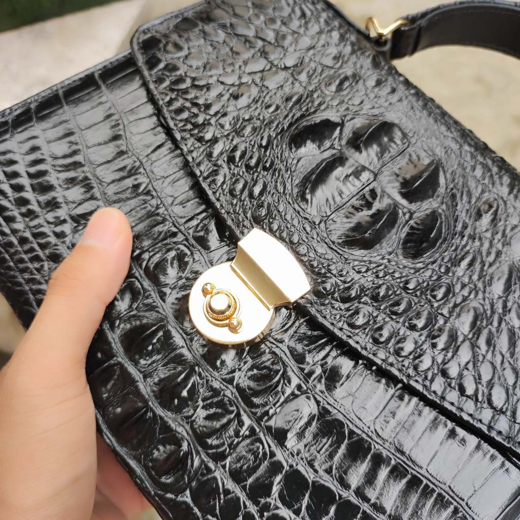 Túi xách cá sấu Nữ thiết kế hình thang có dây đeo. Phiên bản màu đen quý phái!